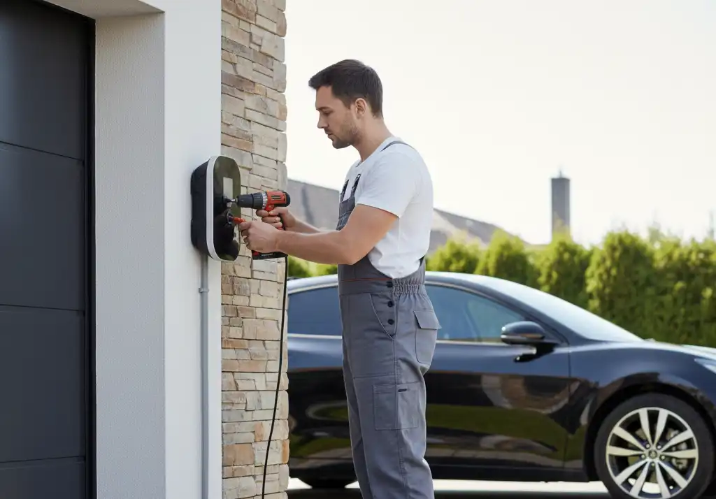 Installation of 7 kW–22 kW home charging points with tidy cabling and wall-mounted design, compatible with all major EV brands including Tesla, BMW, and Nissan.